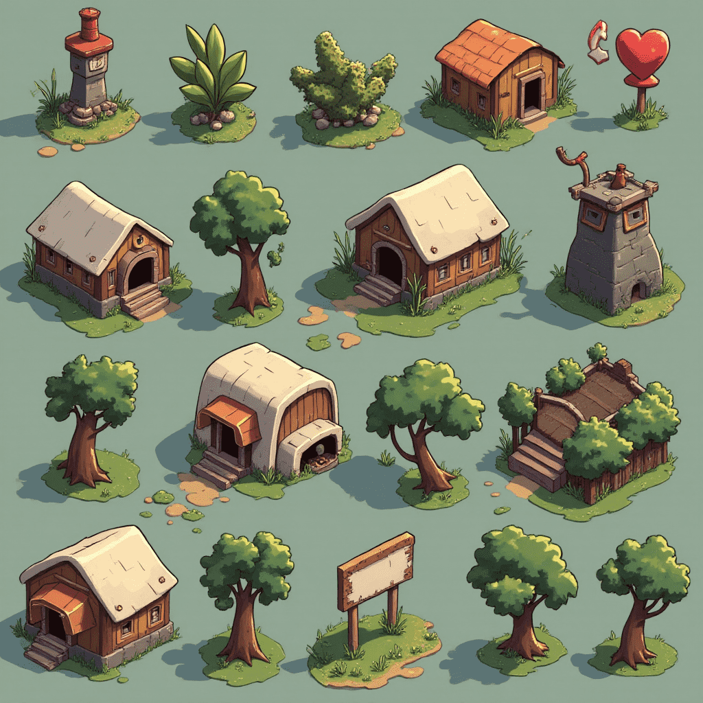 A grid of sixteen whimsical houses and buildings, each unique in design and color, features red roofs, green walls, and diverse architectural elements.