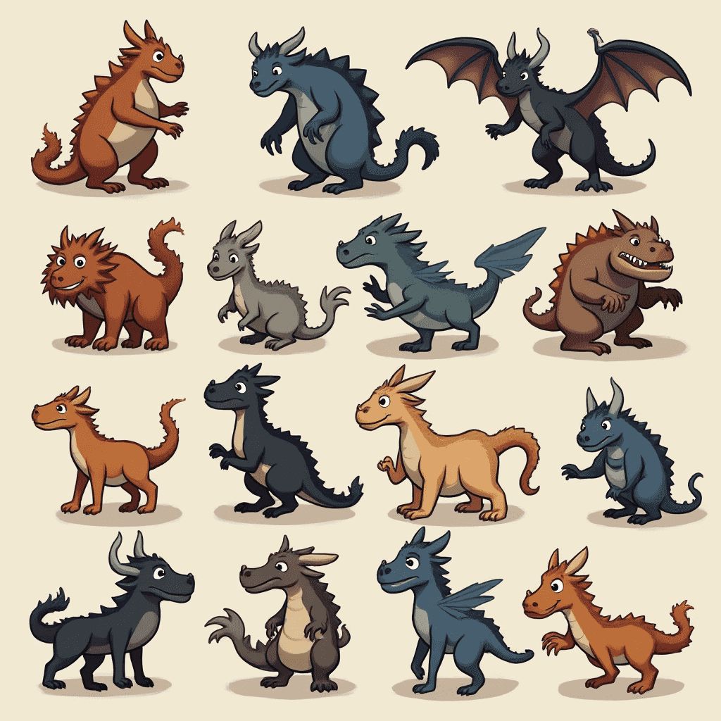 A grid of twelve stylized dragons in various colors and poses, showcasing diverse features and expressions.
