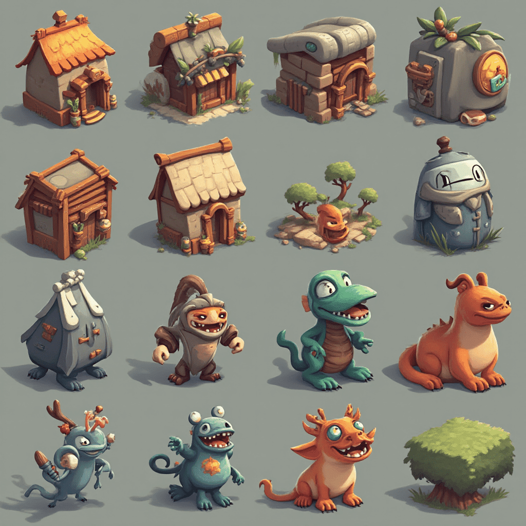 A grid of twelve unique, cartoon-style buildings with diverse features and colors.