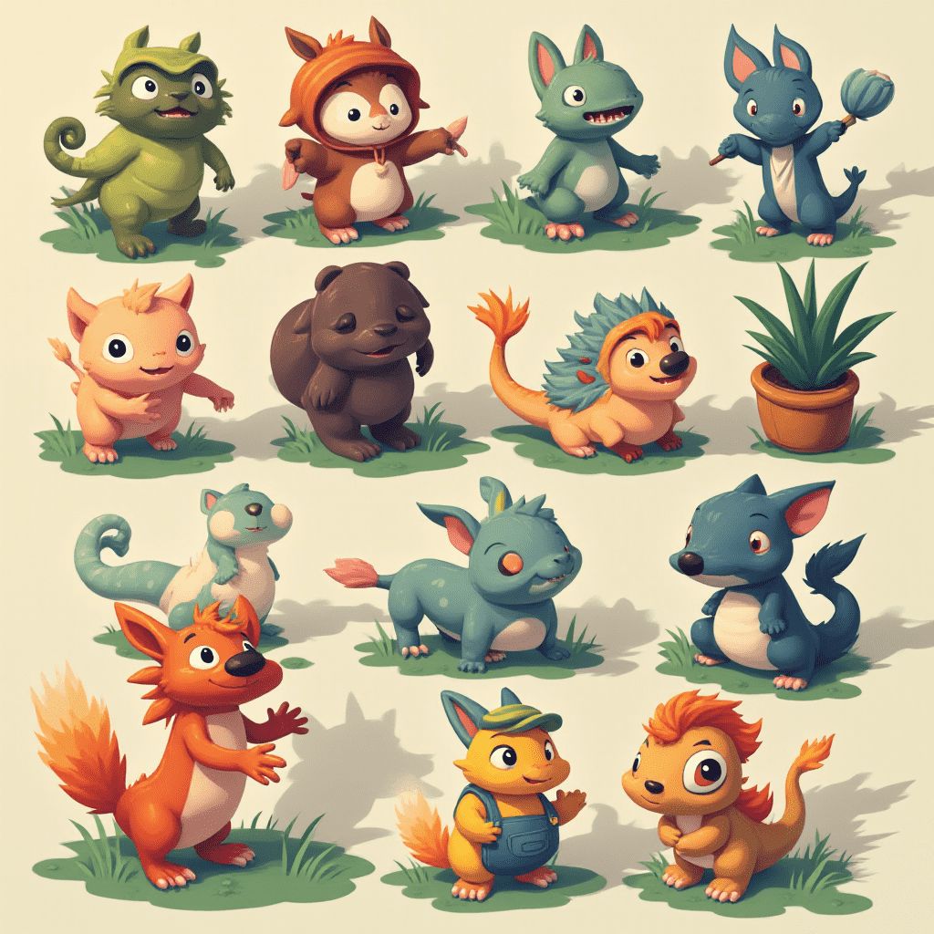 A grid of twelve whimsical, cartoon-style creatures in various colors and poses, set against a light green backdrop.