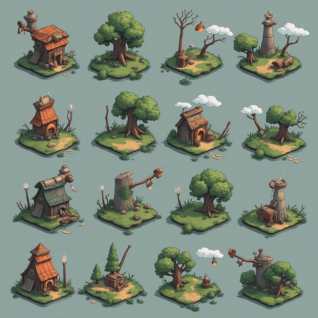 A grid of twelve whimsical houses and trees, each unique in style and function, sits on a verdant green ground.