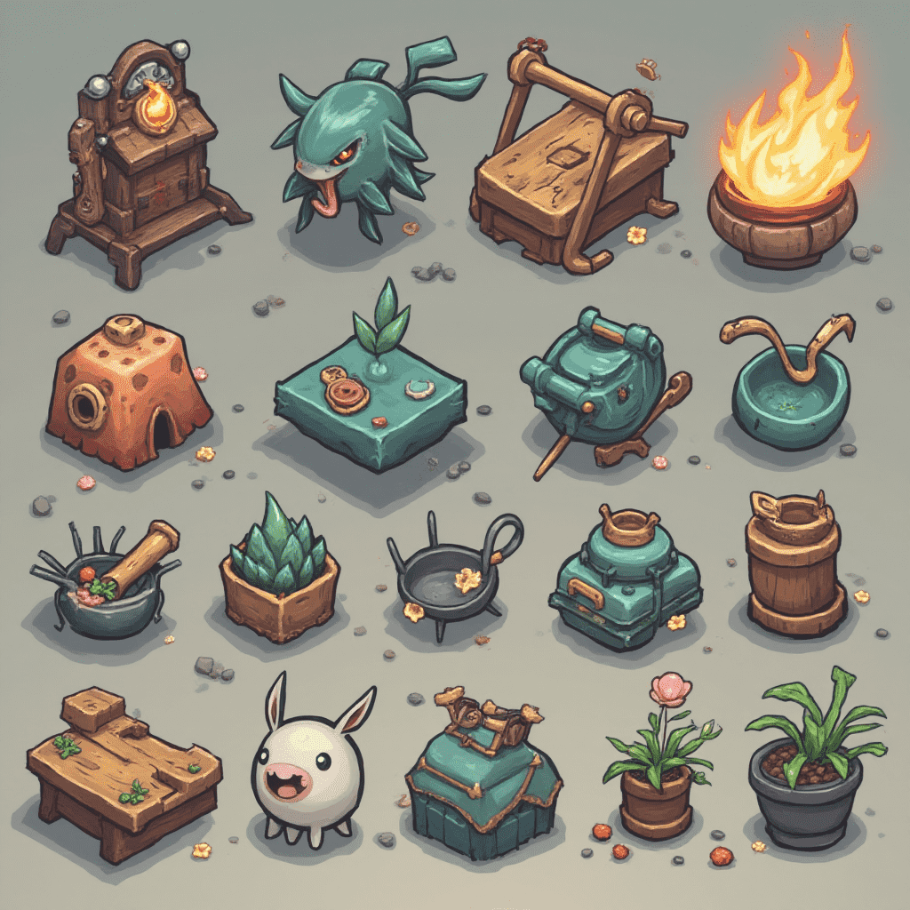 A grid of unique objects, including a grandfather clock, wooden bench, fire pit, and various containers, is set against a neutral gray backdrop.