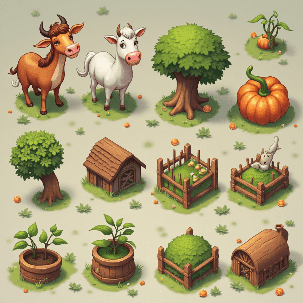 An illustration features a cow, tree, pumpkin, birdhouse, planter, and shed in a farm setting.