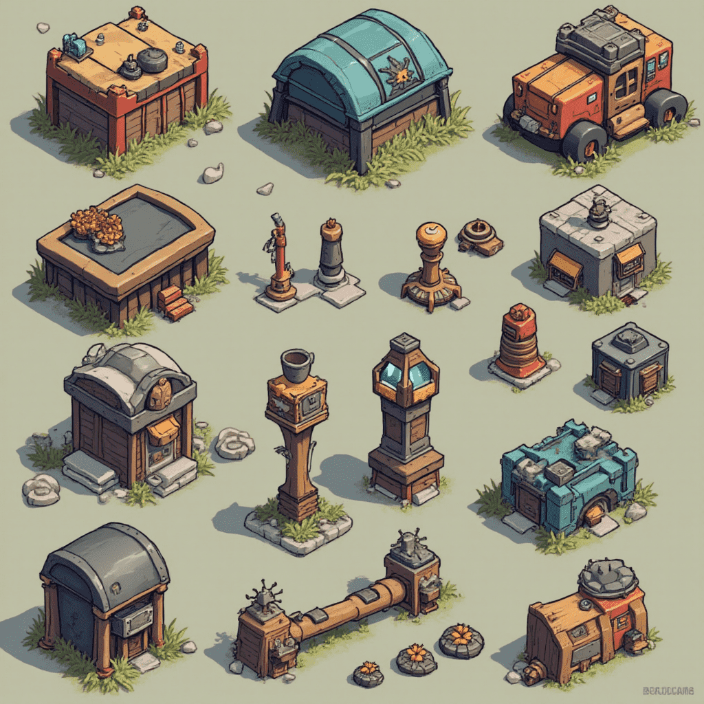 An isometric collection of colorful, whimsical buildings and structures in various styles and colors, set against earthy tones.