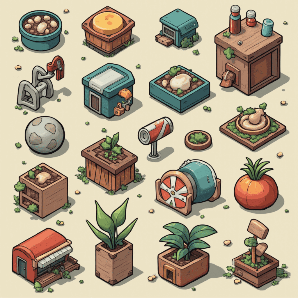 An isometric collection of miniature buildings and objects, including a dog house, birdhouse, barrel, ball, plant pot, pumpkin, and shed, features bright colors and simple designs.