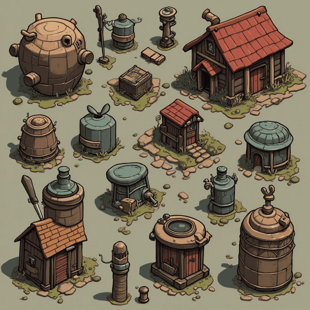 An isometric collection of miniature wooden and metal structures, including a barrel house, shed, well, chest, and bucket, features earthy tones and rustic charm.