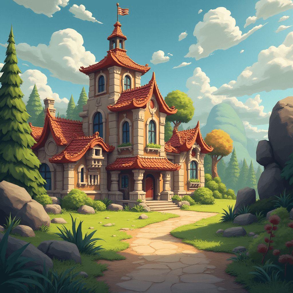 A multi-level red-roofed house with blue windows and a flag stands on a winding stone path, surrounded by greenery, rocks, and a distant mountain.