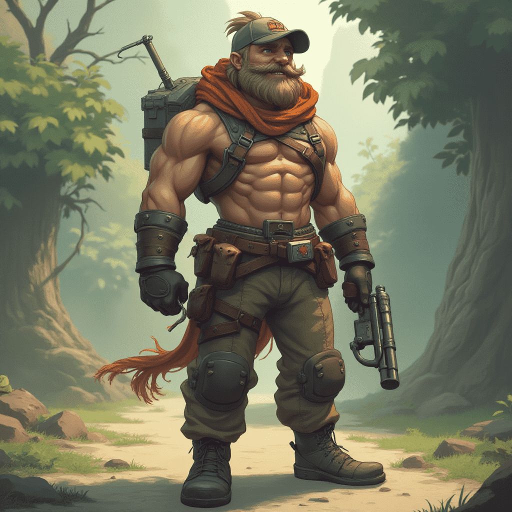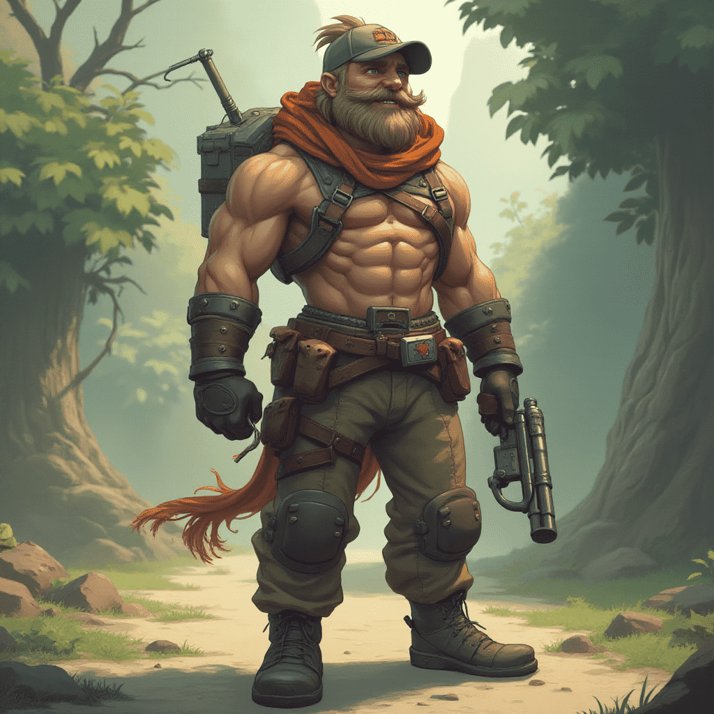 A muscular man in green camouflage, carrying a rifle and backpack, stands in a forest, exuding confidence and readiness.