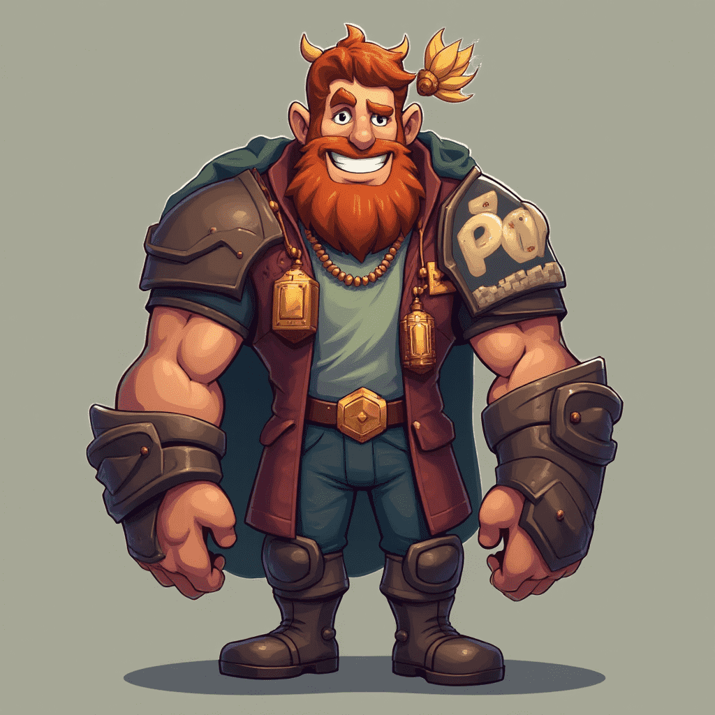 A muscular man with red hair, beard, and gold accessories stands confidently, wearing a brown jacket, green shirt, and red pants.