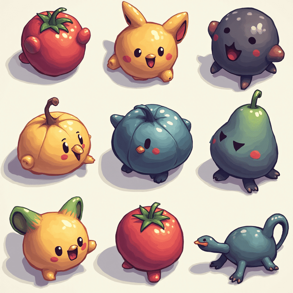 Nine anthropomorphic fruits and vegetables, each with a unique color and expression, appear in a vibrant arrangement.