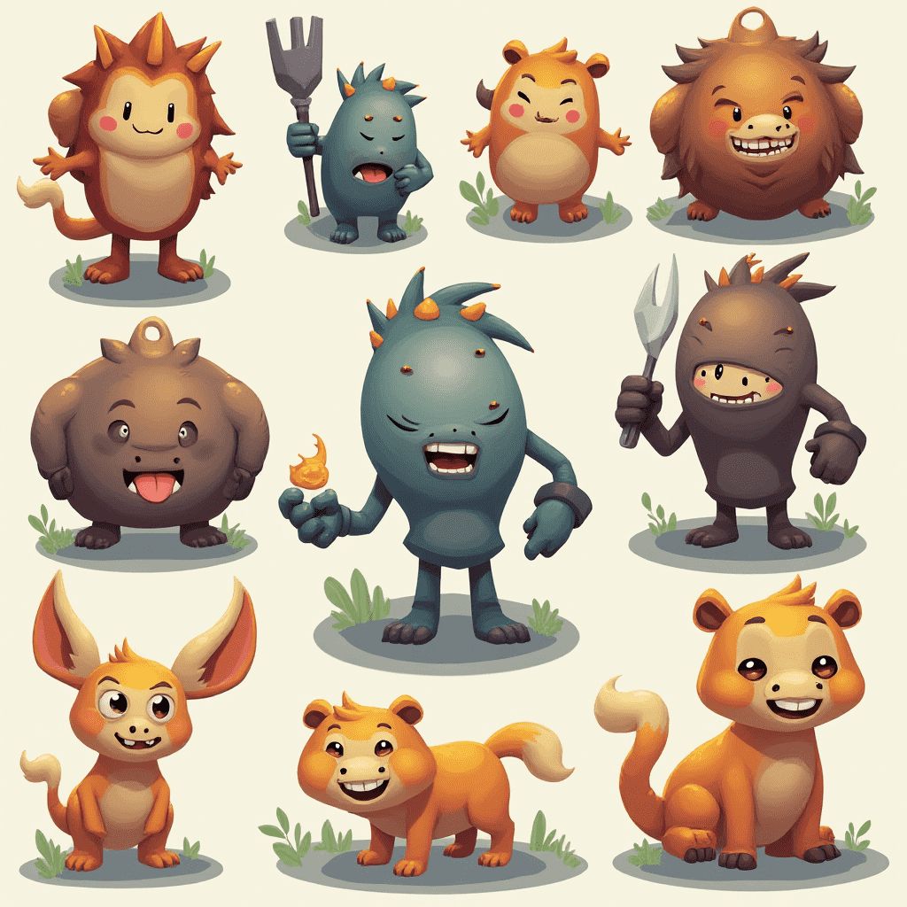 Nine cartoon creatures, each unique in appearance and pose, populate a grid against a light beige background.