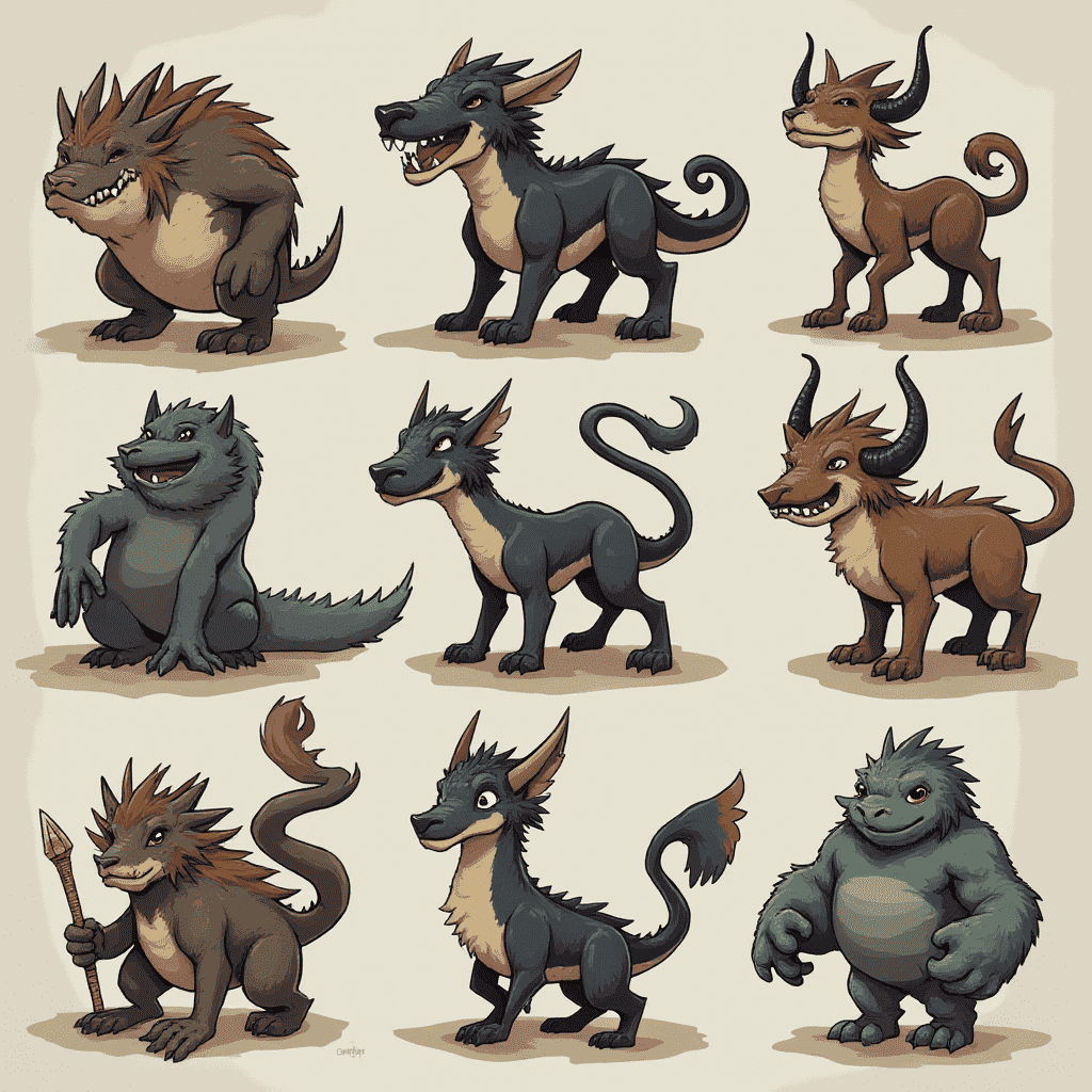 Nine cartoon creatures, varying in color and form, stand on dirt patches against a light beige backdrop.
