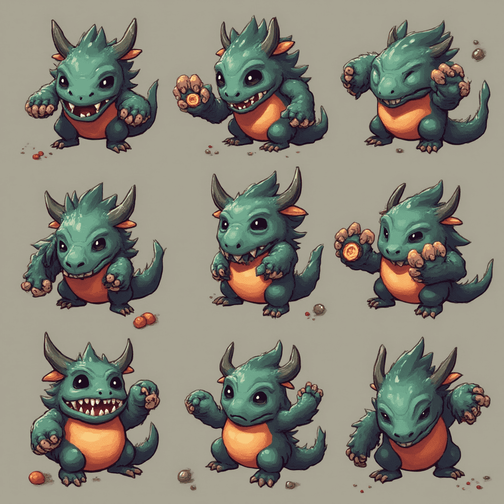 Nine cartoon dragons in various poses, displaying green bodies, orange chests, and horns, interact with small objects against a light gray backdrop.
