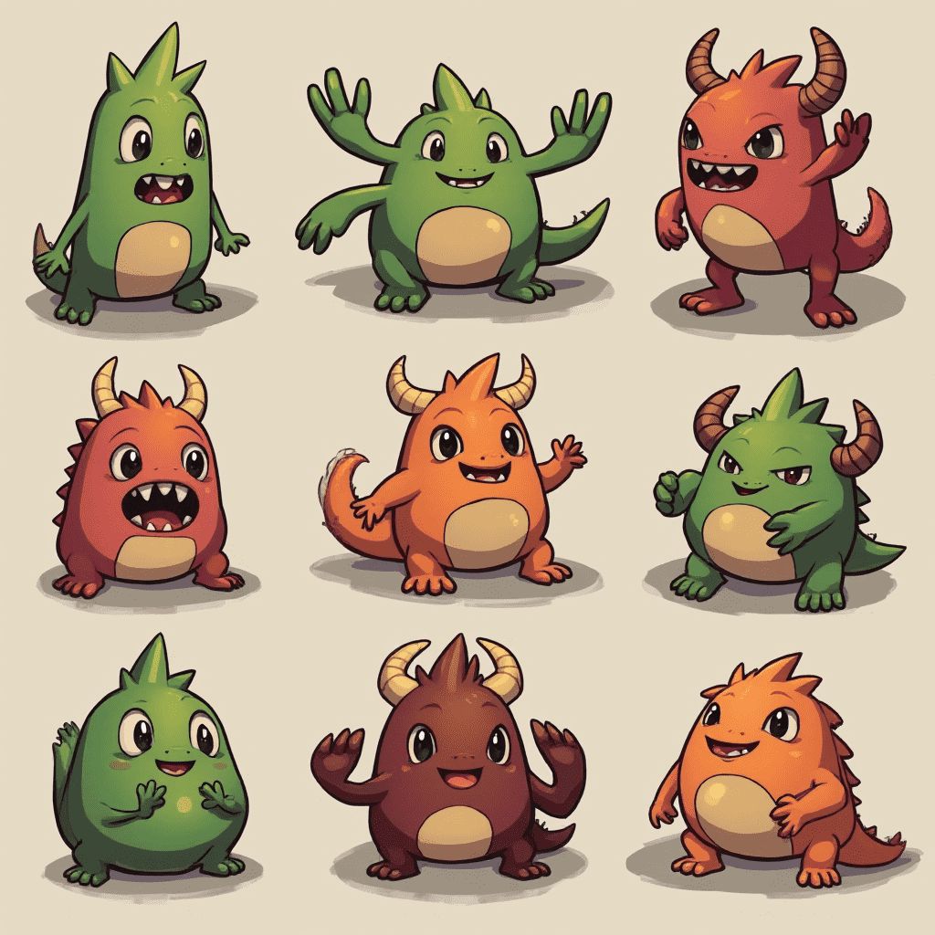 Nine cartoon monsters in various colors and poses, displaying diverse expressions and postures.