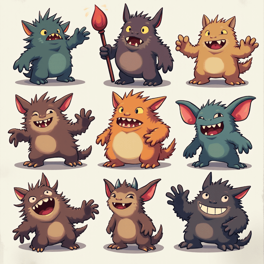 Nine cartoon monsters in various colors and poses, displaying diverse expressions and actions.