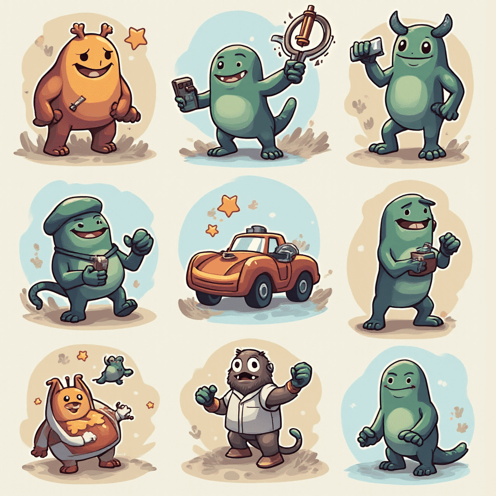 Nine cartoon monsters in various poses and colors, holding objects and interacting with each other.