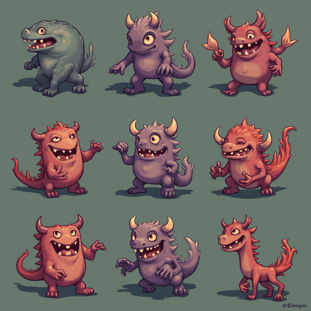 Nine cartoon monsters in various shades of red, orange, purple, and gray stand and sit against different colored backgrounds.