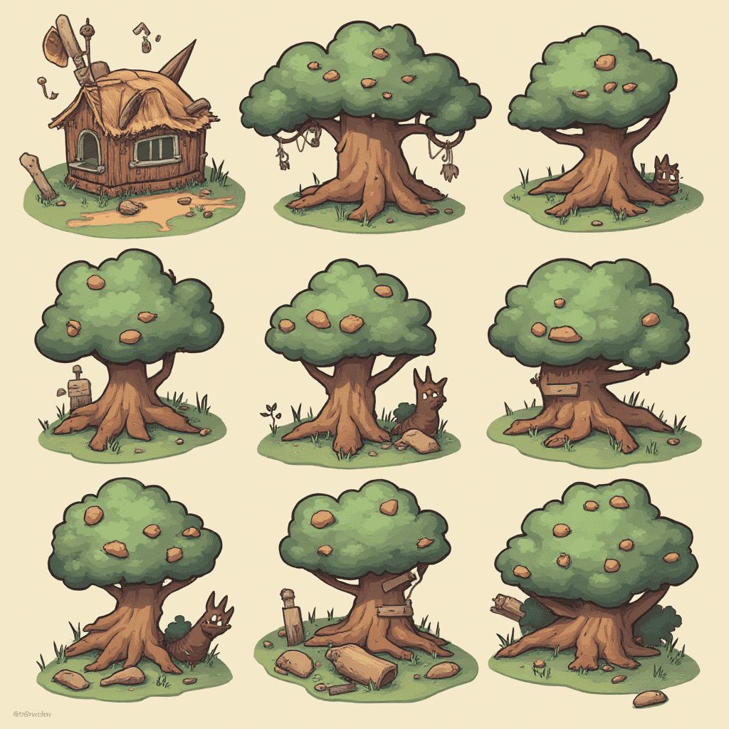 Nine cartoon trees, each unique in appearance and setting, populate a grid against a light beige background.