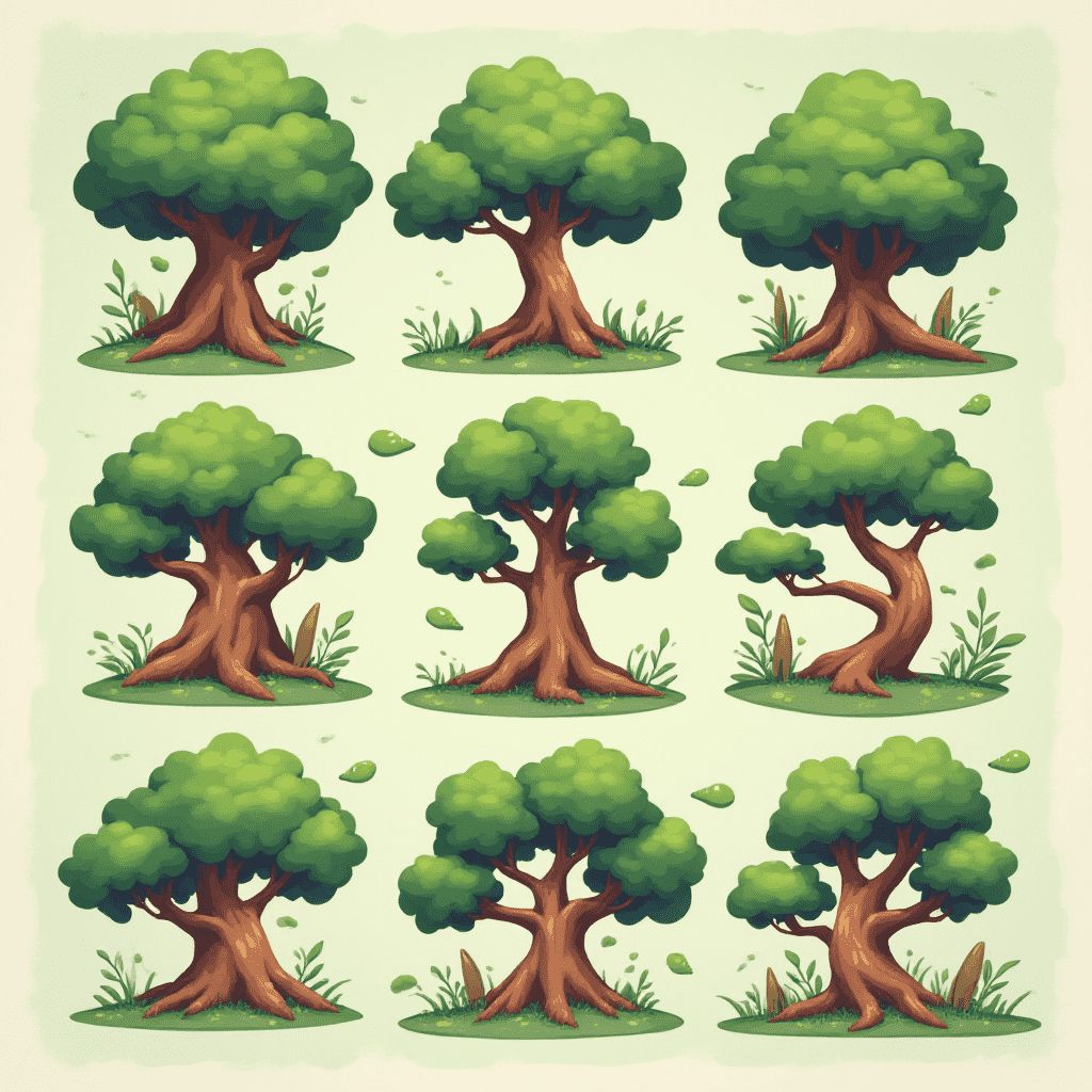 Nine cartoon trees with varying foliage and ground cover, arranged in a three-by-three grid.