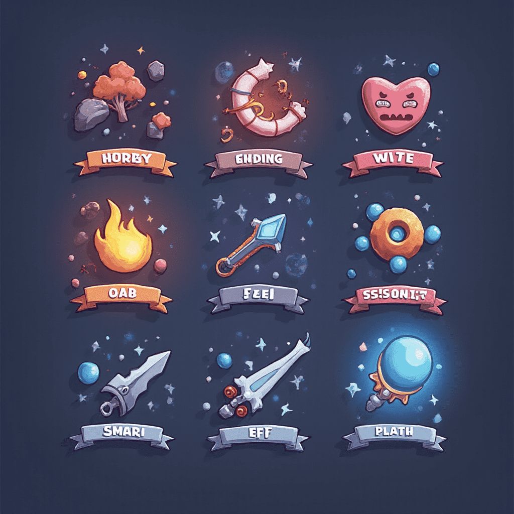 Nine colorful icons, each with a unique name and attribute, are arranged in a 3x3 grid against a dark blue background.
