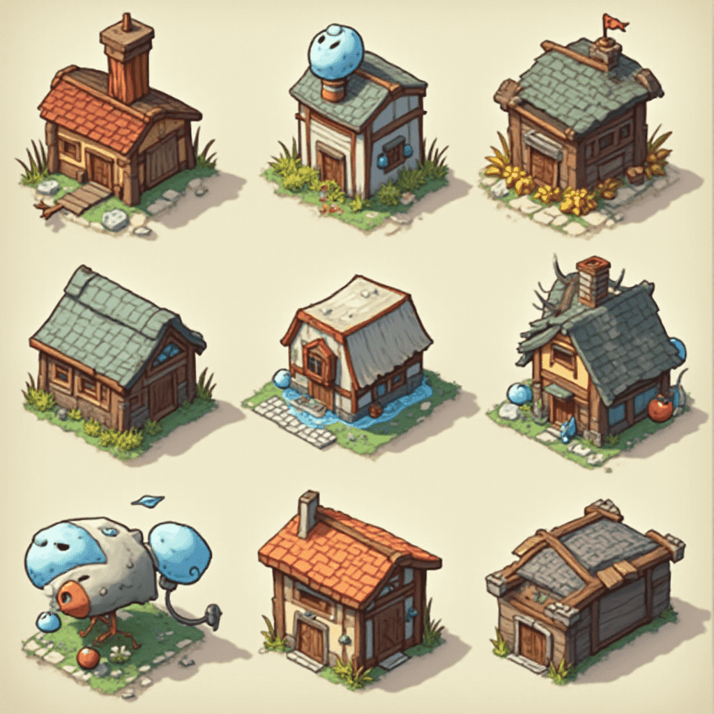 Nine colorful, whimsical houses with unique features are arranged in a 3x3 grid against a light beige backdrop.