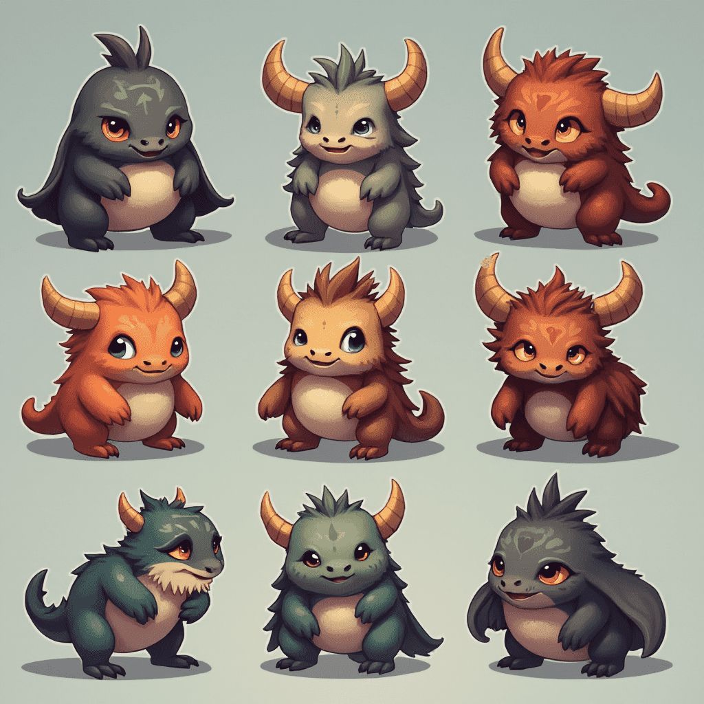 Nine cute creatures with horns and varying colors stand in a three-by-three grid, displaying diverse expressions and postures.