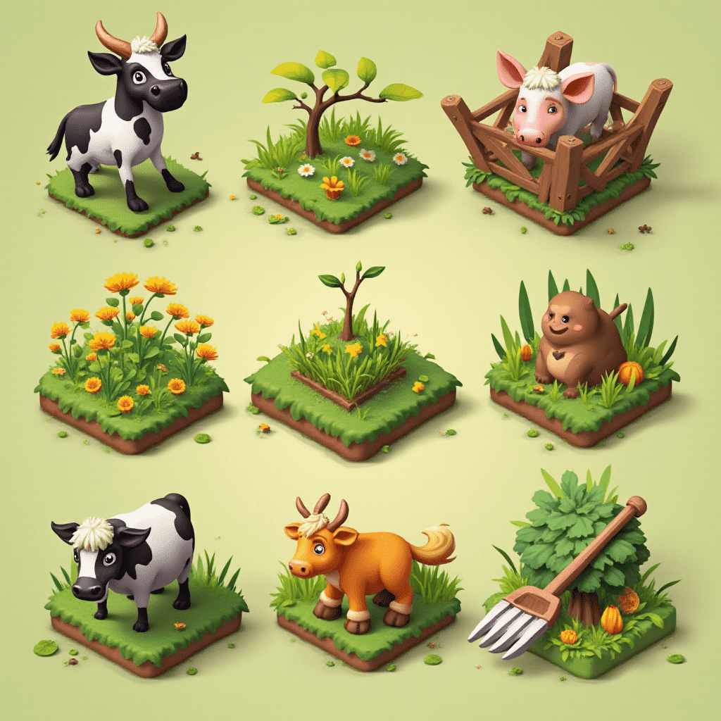 Nine farm animals - cow, pig, chicken, sheep, cow, pig, cow, pig, cow - graze and interact in a pastoral setting.