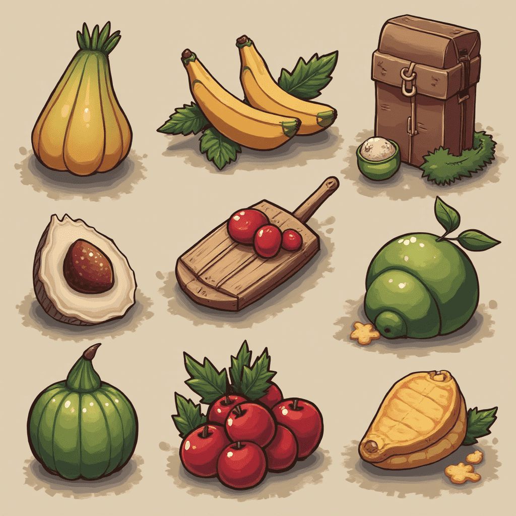 Nine fruits and vegetables, including a squash, bananas, avocado, tomato, pear, cucumber, squash, and pineapple, arranged in three rows.