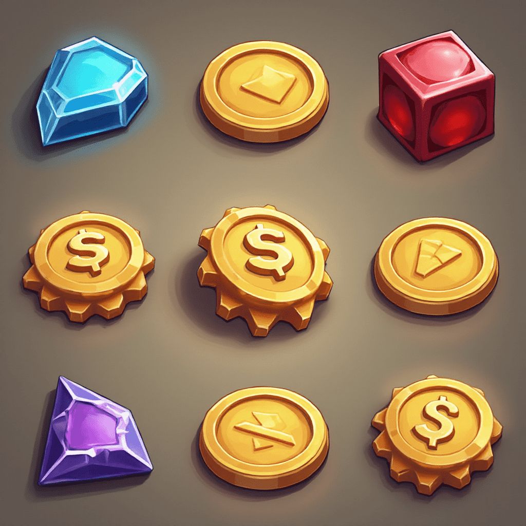 Nine gold coins with dollar signs, a blue gemstone, and a red cube are arranged in a 3x3 grid on a brown background.