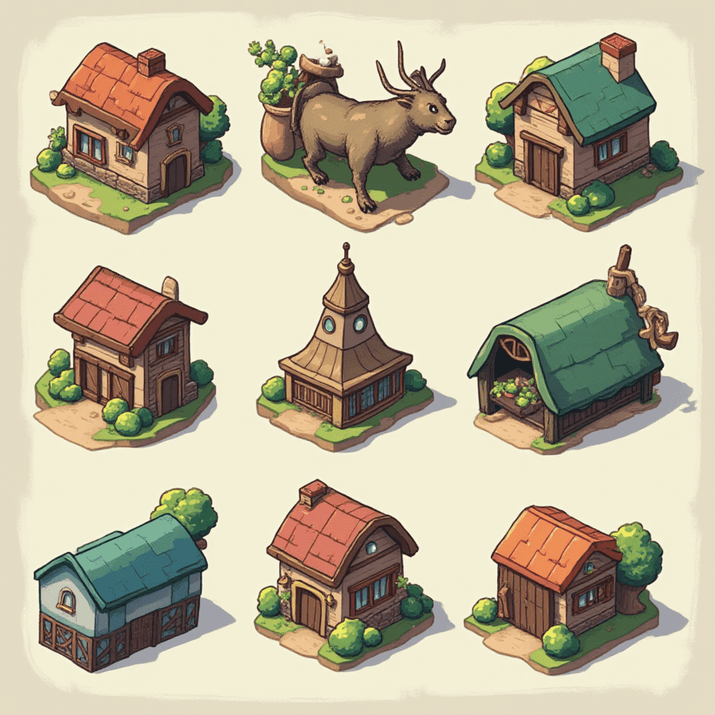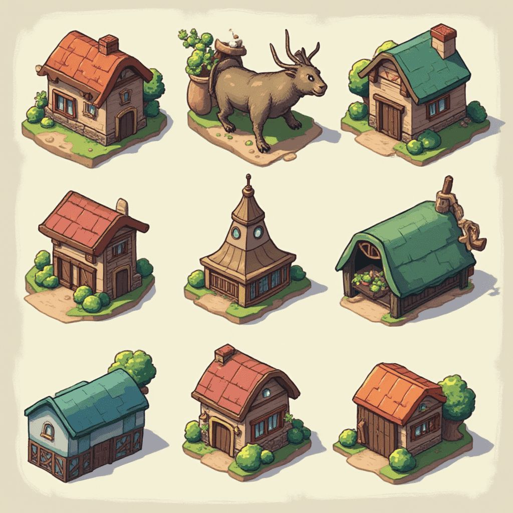 Nine houses with unique designs and colors are arranged in a 3x3 grid, including a cow statue.