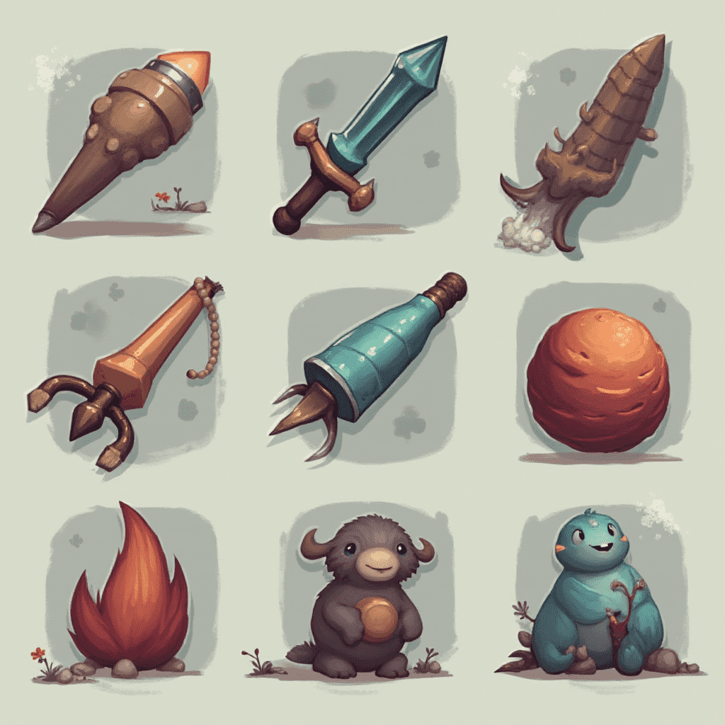 Nine illustrated objects include a wooden staff, sword, beetle, orb, staff with beads, claw, bear, and fire.