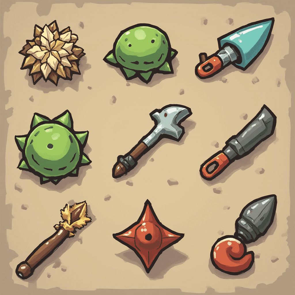 Nine illustrated weapons, including a crystal ball, green shell, sword, axe, star-shaped dagger, curved knife, red hook, and a pointed staff, are arranged on a beige background.