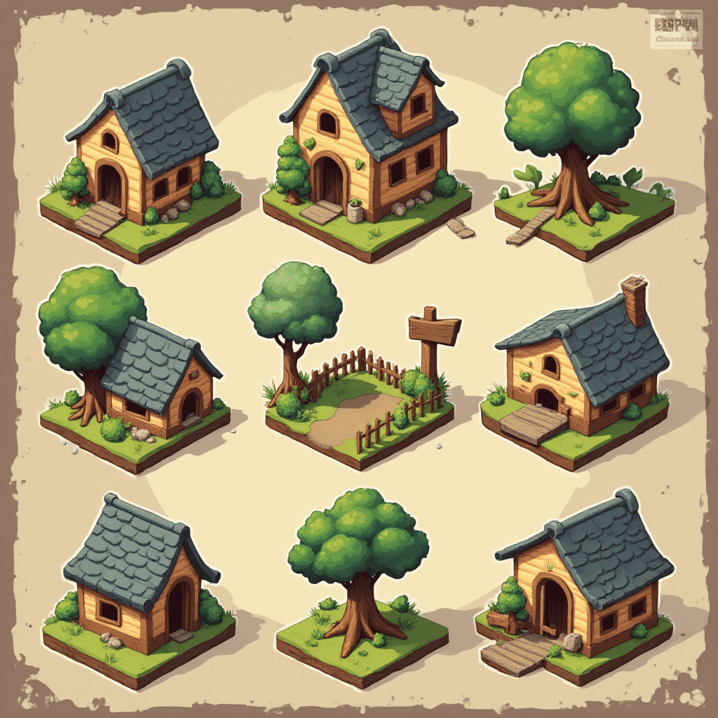Nine isometric houses with wooden roofs and walls, complete with trees, are arranged in a 3x3 grid on a beige textured background.