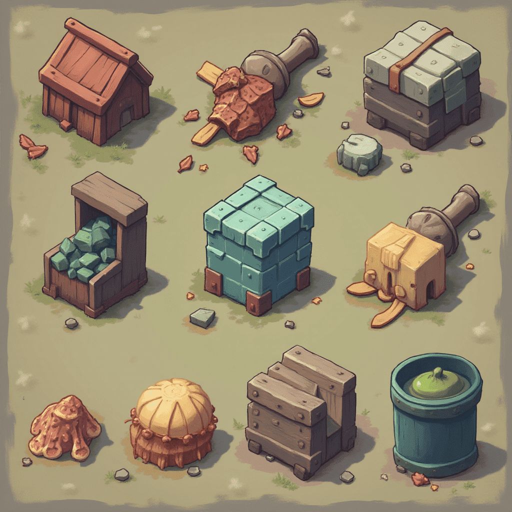 Nine isometric illustrations depict various objects and structures in a forest-like setting, including wooden buildings, stone towers, a wooden chest, a stone tower, a wooden barrel, a stone birdhouse, a stone mushroom, and a stone fish.
