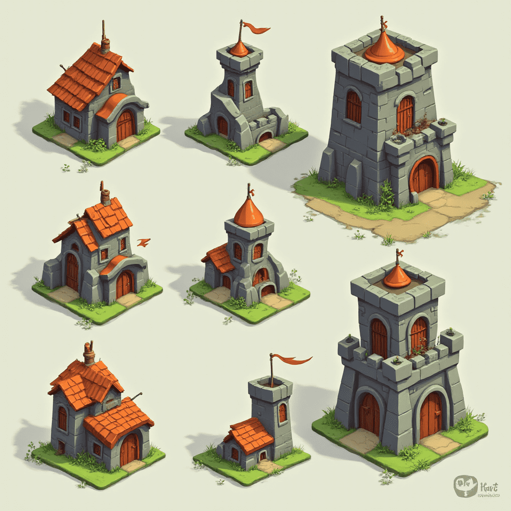 Nine isometric illustrations of medieval-style buildings feature red roofs, gray walls, and orange accents on towers, doors, and windows.
