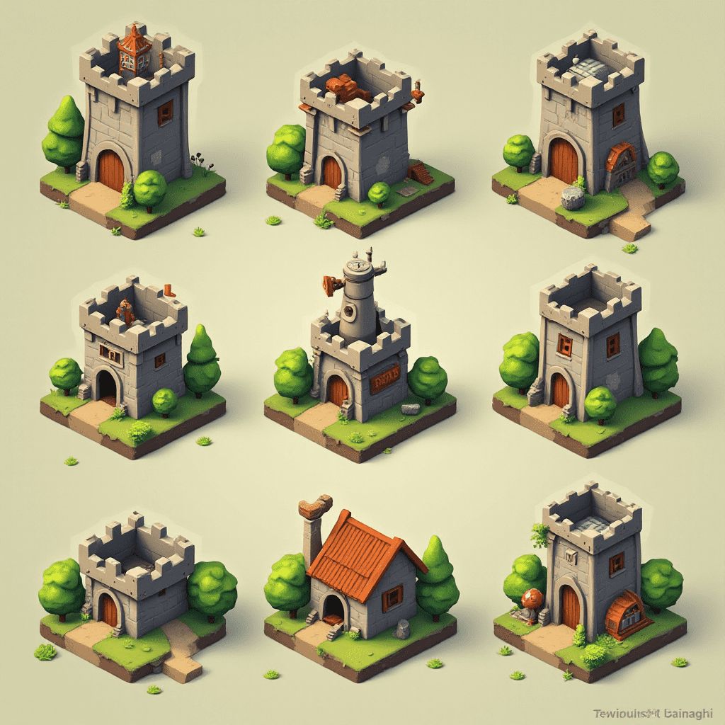Nine isometric illustrations of medieval-style buildings feature gray stone, green grass, and red roofs, with varying architectural elements.