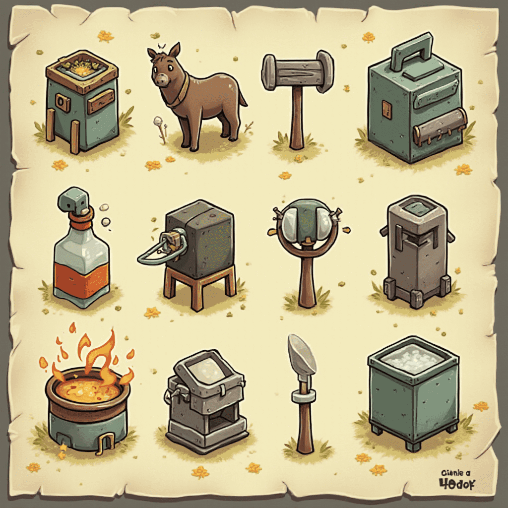 Nine objects, including a wooden box, hammer, donkey, bottle, furnace, bucket, spoon, and box, are arranged in a 3x3 grid on a parchment-like background.