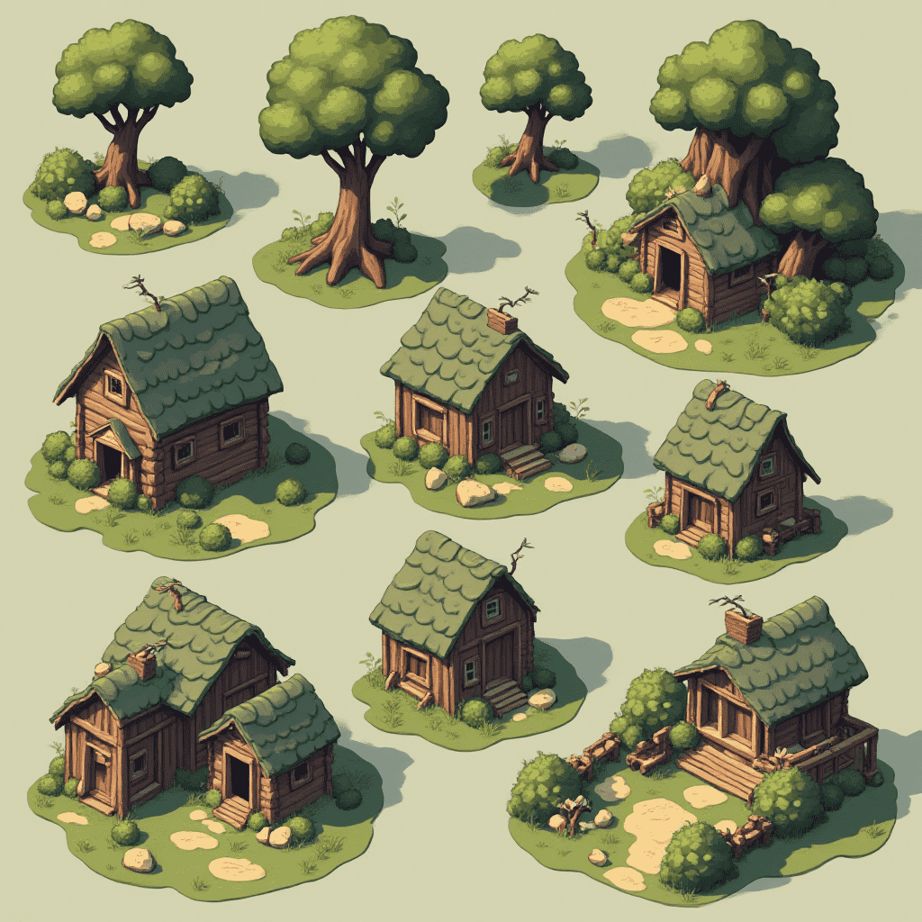 Nine rustic wooden houses with green roofs and trees are arranged on grassy isles, showcasing a charming, hand-drawn style.