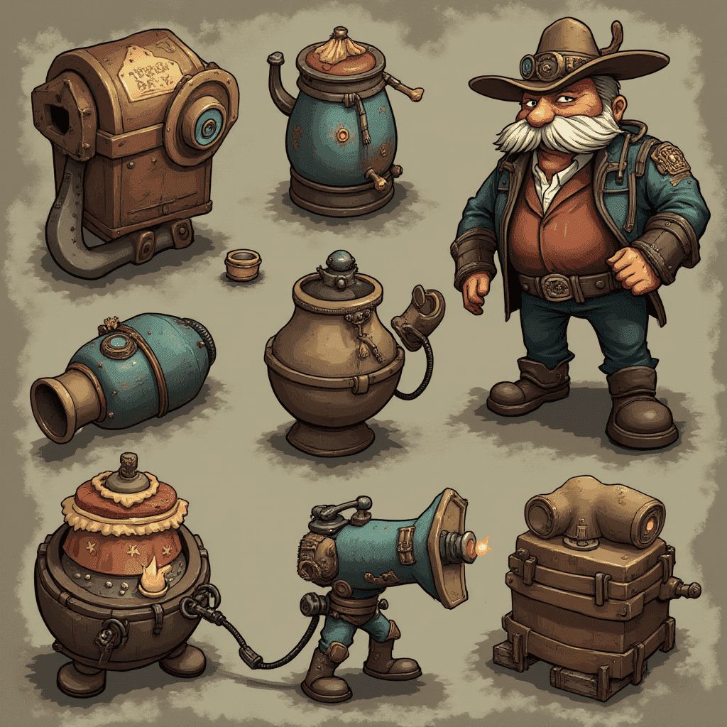 Nine steampunk-themed objects, including a wooden chest, teapot, funnel, barrel, suitcase, and megaphone, are arranged against a muted gray backdrop.