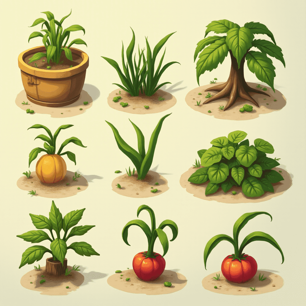 Nine stylized plants, including a potted succulent, grass, tree, squash, tomato, and leafy greens, are arranged in a 3x3 grid.