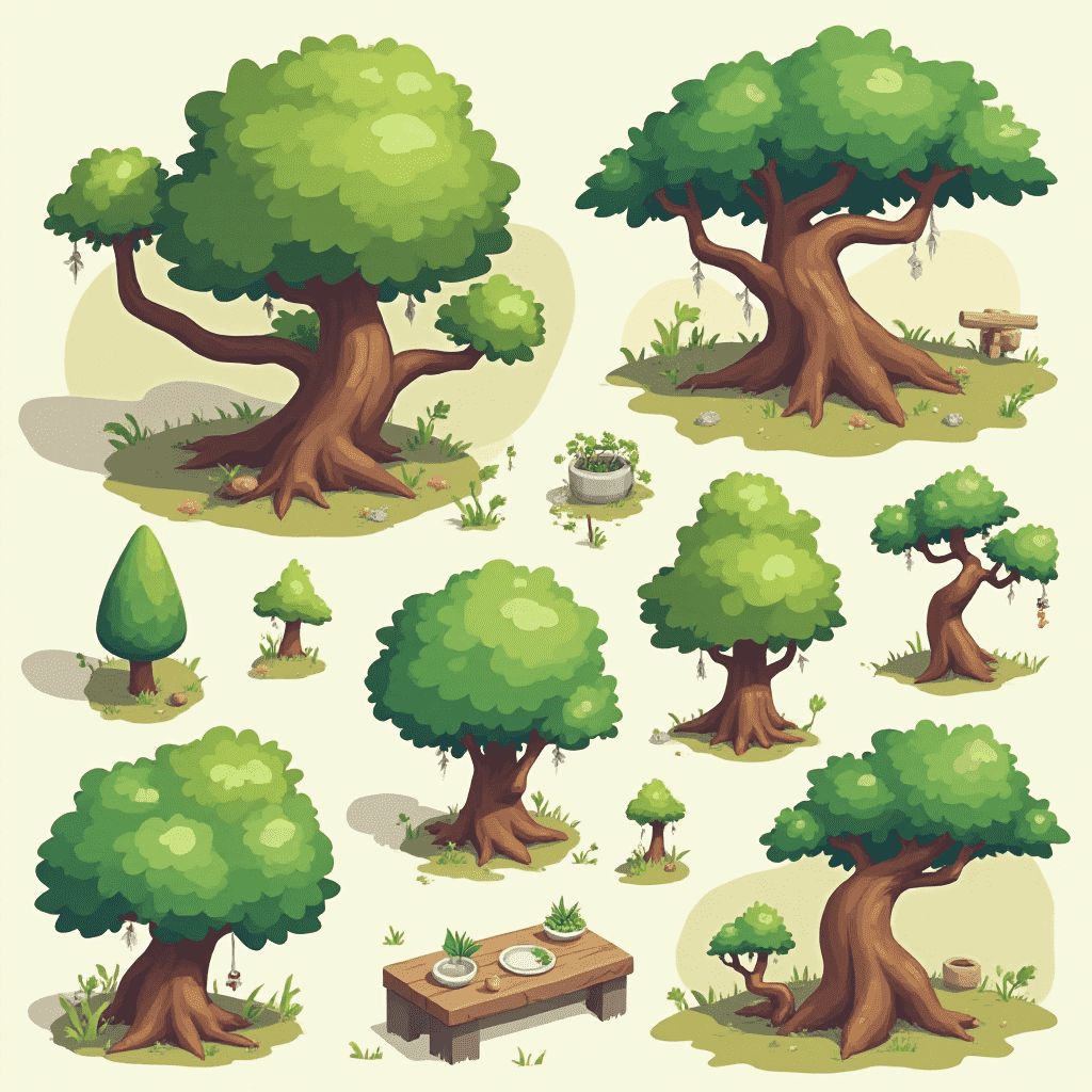 Nine stylized trees with unique features and objects, including a birdhouse, bench, and bowl, populate a natural setting.