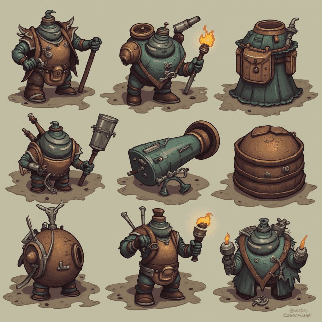 Nine unique green robots, each with distinct features and weapons, stand on dirt patches against a light beige backdrop.