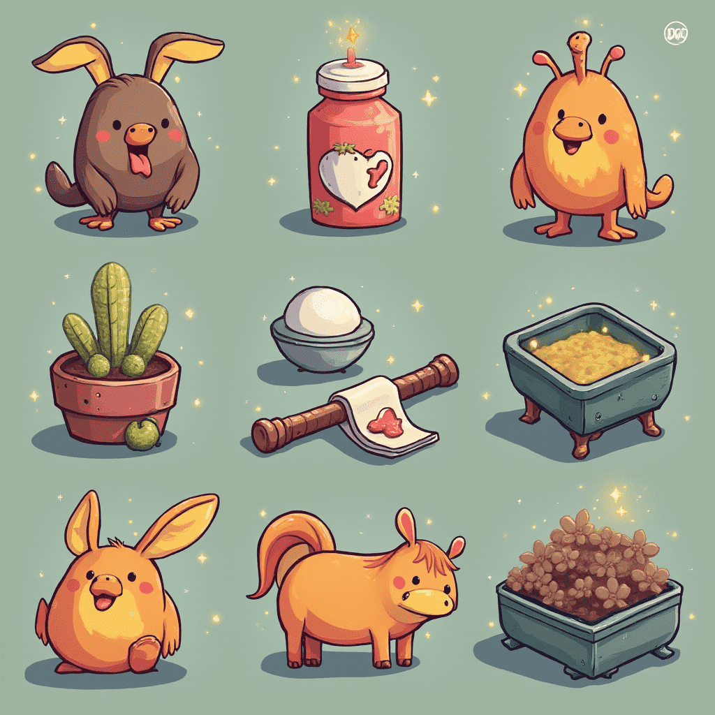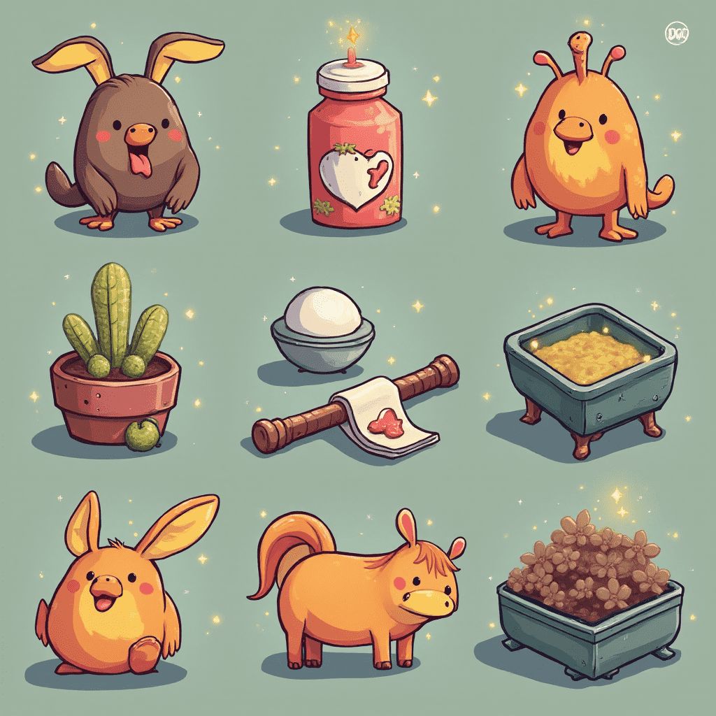 Nine whimsical cartoon animals and objects, including a rabbit, bird, jar, candle, cactus, egg, rolling pin, flower pot, and food dish, are arranged in a 3x3 grid.