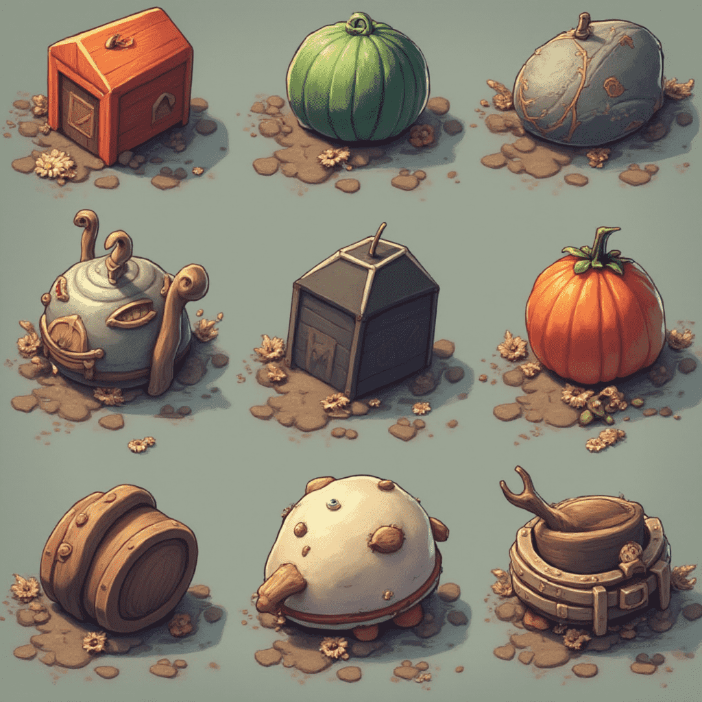 Nine whimsical houses and pumpkins, each unique in shape and color, populate a quaint village scene.