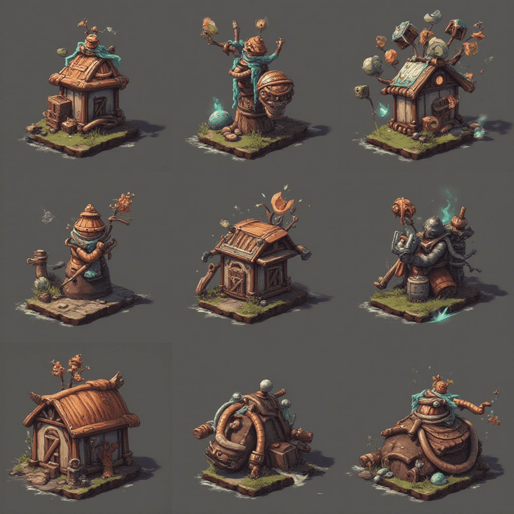 Nine whimsical houses, each unique in design and color, populate a grid on a dark gray background.
