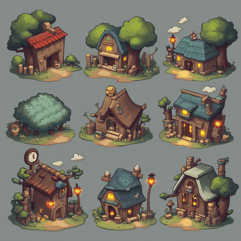 Nine whimsical houses, each unique in design and color, populate a quaint village scene with trees, flowers, and warm lighting.