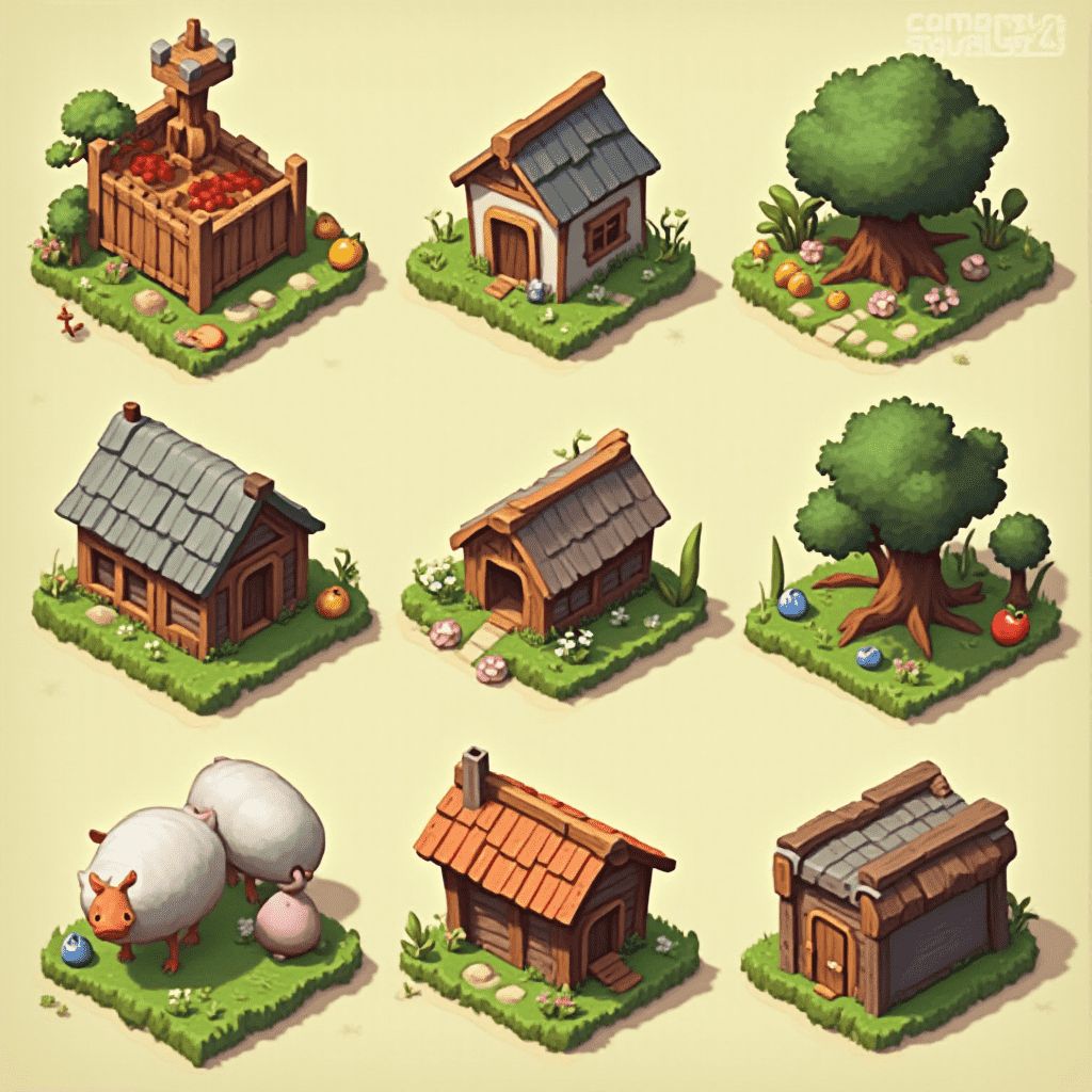 Nine whimsical houses, each unique in style and color, populate a quaint village scene with vibrant characters.