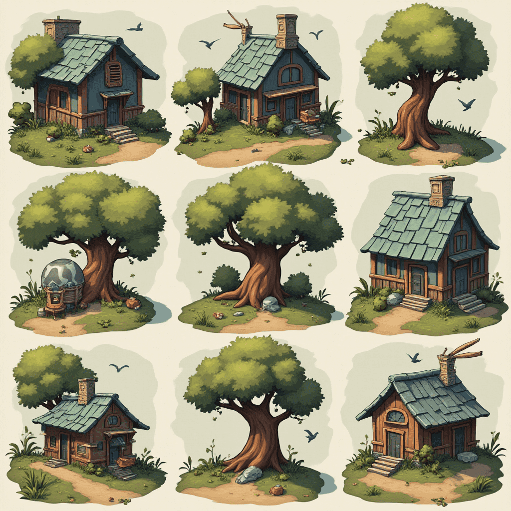 Nine whimsical houses with green roofs, trees, and birds are arranged in a 3x3 grid against a light beige backdrop.