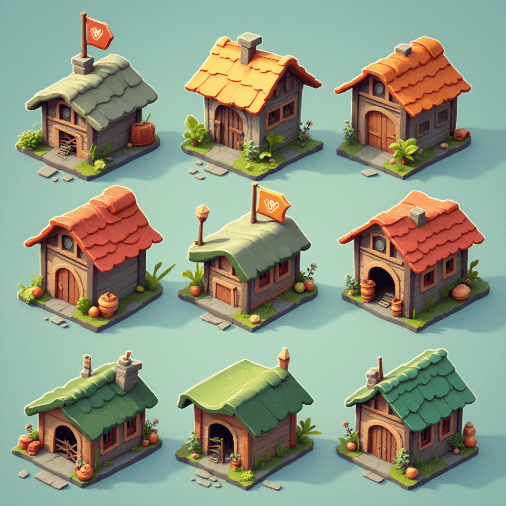 Nine whimsical houses with unique features and colors are arranged in a 3x3 grid against a light blue backdrop.