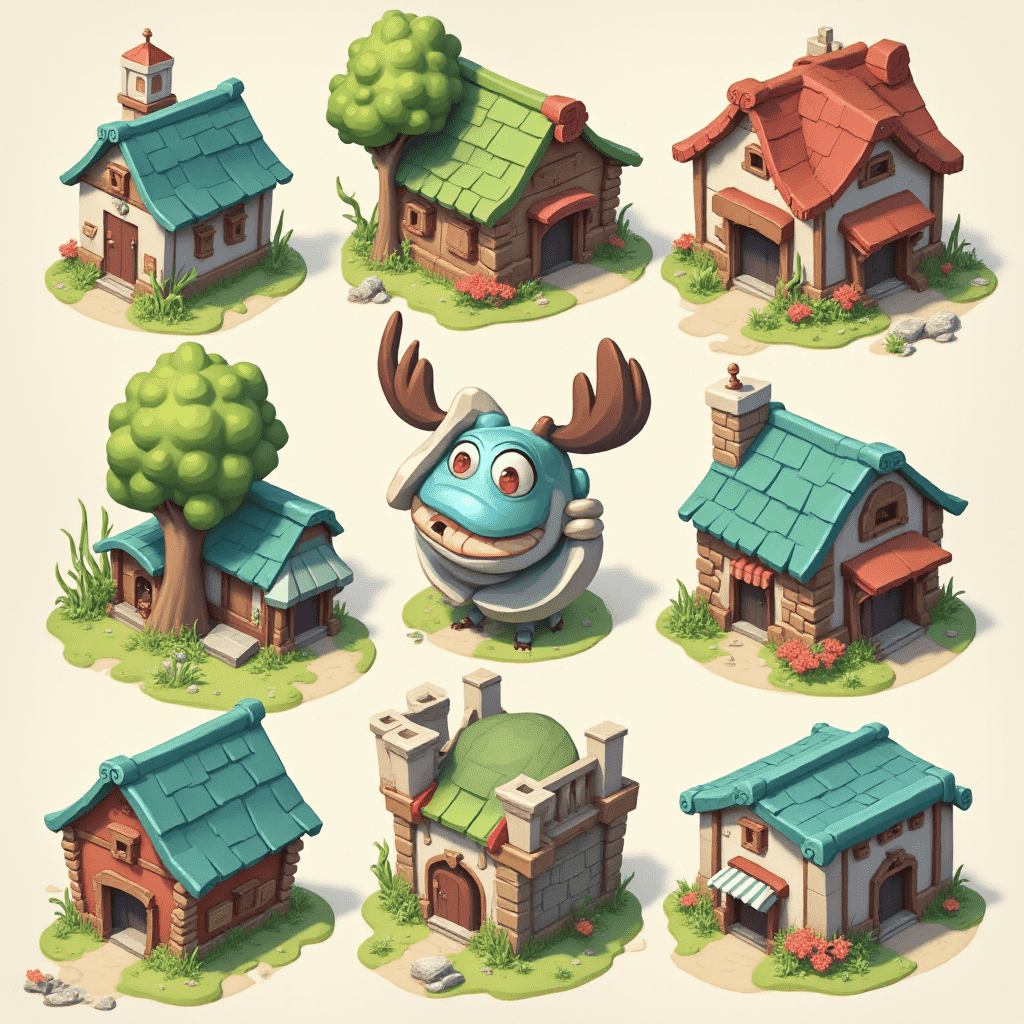 Nine whimsical houses with unique features are arranged in a 3x3 grid, featuring a blue monster in the center.